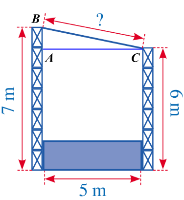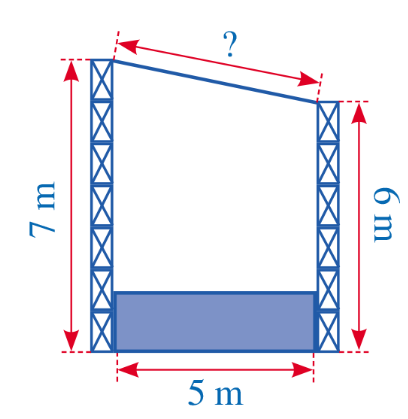 Hình dưới đây mô tả mặt cắt đứng của một sân khấu ngoài trời có mái che. Chiều cao của khung phía trước khoảng \(7\;{\rm{m}}\), chiều cao của khung phía sau là \(6\;{\rm{m}}\), hai khung cách nhau một khoảng là \(5\;{\rm{m}}\). Chiều dài của mái che sân khấu đó là bao nhiêu mét (làm tròn kết quả đến hàng phần trăm)?