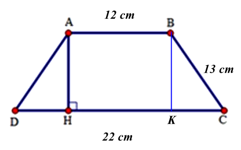 Cho hình thang cân ABCD đáy nhỏ \(AB = 12\;{\rm{cm}}\), đáy lớn \(CD = \) \(22\;{\rm{cm}}\), cạnh bên