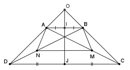Cho hình thang cân \({\rm{ABCD}}({\rm{AB}}//{\rm{CD}},{\rm{AB}} < {\rm{CD}}),{\rm{AD}}\) cắt \({\rm{BC}}\) tại \({\rm{O}}\).