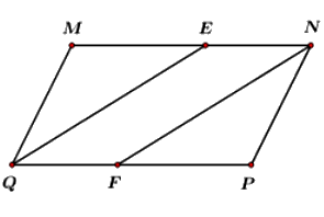 Cho hình bình hành MNPQ. Tia phân giác góc \(Q\) cắt MN tại \(E\), tia phân giác góc \(N\) cắt PQ tại \(F\). Chứng minh QENF là hình bình hành.