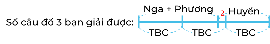 Vẽ sơ đồ của bài toán, tính trung bình cộng số câu đố 3 bạn giải được, từ đó tính số câu đố Huyền giải được.