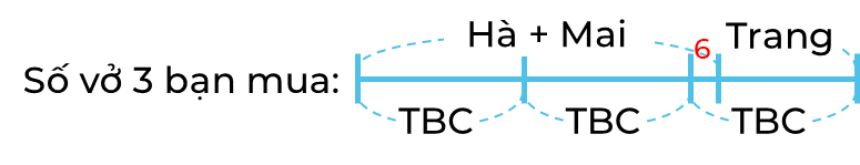 Vẽ sơ đồ của bài toán, tính trung bình cộng số quyển vở 3 bạn đã mua, từ đó tính số quyển vở Trang đã mua.