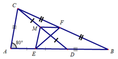 Cho tam giác \({\rm{ABC}}\) có \(\angle A = 80^\circ (AB > AC)\). Trên cạnh \({\rm{AB}}\) lấy điểm \({\rm{D}}\) sao cho \({\rm{BD}} = {\rm{AC}}\).Gọi \({\rm{E}},{\rm{F}}\) lần lượt là trung điểm \({\rm{AD}},{\rm{BC}}\). Tính số đo góc \({\rm{BEF}}\).