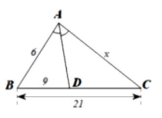 Cho tam giác ABC . Tia phân giác góc trong của góc \({\rm{A}}\) cắt \({\rm{BC}}\) tại \({\rm{D}}\). Cho \(AB = 6,AC = x,BD = 9,BC = 21\). Độ dài \({\rm{x}}\) bằng: