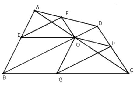 Cho tứ giác \({\rm{ABCD}}\) có \({\rm{AC}}\) và \({\rm{BD}}\) cắt nhau tại \({\rm{O}}\). Qua \({\rm{O}}\), kẻ đường thẳng song song với \({\rm{BC}}\) cắt \({\rm{AB}}\) tại \({\rm{E}}\), qua O kẻ đường thẳng song song với \({\rm{CD}}\) cắt \({\rm{AD}}\) tại \({\rm{F}}\).