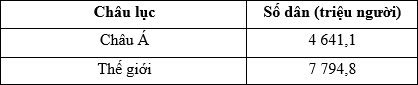 Cho bảng số liệu sau:Số dân, mật độ dân số của châu Á và thế giới năm 2020Tính tỉ lệ %
