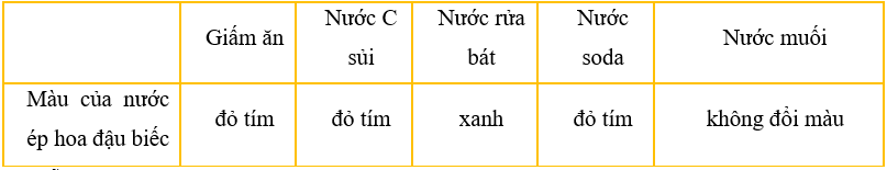 Hoa đậu biếc có chứa các hợp chất hữu cơ mang màu (các hợp chất hữu cơ thuộc nhóm anthocyanin – một trong những chất chống oxi hoá tự nhiên) và màu sắc của chúng thay đổi theo pH của môi trường. Ở môi trường pH nhỏ hơn 7, anthocyanin chuyển sang màu đỏ tím, môi trường pH lớn hơn 7 chúng chuyển sang màu xanh sẫm. Một học sinh tiến hành thí nghiệm sử dụng nước ép của hoa đậu biếc cho lần lượt vào các mẫu dung dịch: giấm ăn, nước C sủi, nước rửa bát, nước soda, nước muối thu được hiện tượng sau:
