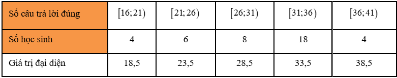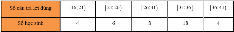 Các bạn học sinh lớp 11A1 trả lời 40 câu hỏi trong một bải kiểm tra. Kết quả được thống kê ở bảng sau. Hãy ước lượng trung bình số câu trả lời đúng của các học sinh lớp \(11{\rm{\;A}}1\)