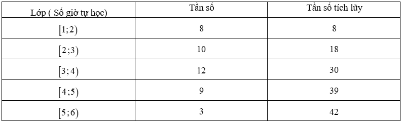 Điều tra \(42\) học sinh của một lớp \(11\) về số giờ tự học ở nhà, người ta có bảng sau