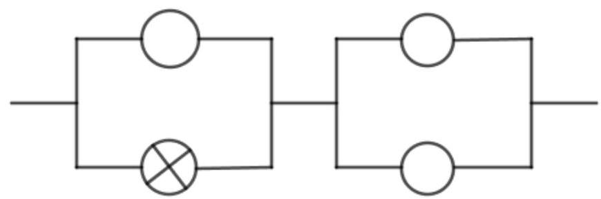 Cho mạch điện gồm 4 bóng đèn, xác suất hỏng của mỗi bóng là 0,05 . Tính xác suất để khi cho dòng điện chạy qua mạch điện thì mạch điện sáng.