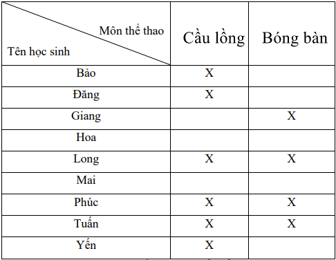 Một tổ trong lớp \(11{\rm{C}}\) có 9 học sinh. Phỏng vấn 9 bạn này với câu hỏi: "Bạn có biết chơi môn thể thao nào trong hai môn này hay không? Nếu biết thì đánh dấu \({\rm{X}}\) vào ô ghi tên môn thể thao đó, không biết thì để trống. Kết quả thu được như sau: