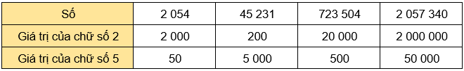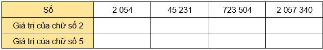 Xác định vị trí của chữ số 2 và chữ số 5 trong mỗi số rồi viết giá trị vào ô tương ứng.