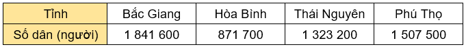 Bảng thống kê dưới đây cho biết số dân của một số tỉnh thành ở Việt Nam năm 2020.