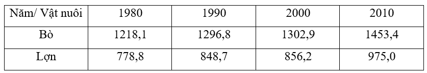 Bảng số liệu sau đây biểu thị số lượng đàn bò và đàn lợn trên thế giới giai đoạn 1980 – 2014 (đơn vị: triệu con)