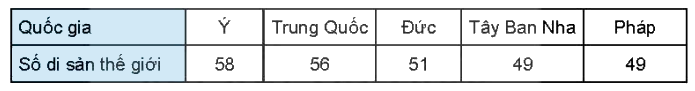 Bảng thống kê sau cho biết số lượng di sản thế giới của 5 quốc gia đứng đầ tính đến tháng 8 năm 2021:
