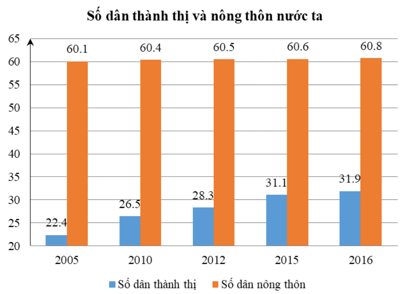 Số dân thành thị và nông thôn nước ta (đơn vị: triệu người) giai đoạn 2005 – 2016 được biểu diễn ở biểu đồ sau: