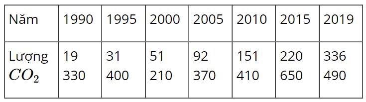b) Cho biết xu thế của lượng khí thải \({\rm{C}}{{\rm{O}}_2}\) của Việt Nam trong giai đoạn này. Năm 2019 lượng khí thải \({\rm{C}}{{\rm{O}}_2}\) của Việt Nam tăng bao nhiêu lần so với năm 1990.