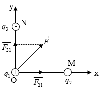 Trong mặt phẳng tọa độ Oxy có ba điện tích điểm \({q_1} = + 4\mu C\), đặt tại gốc O, \({q_2} = - 3\mu C\) đặt tại M trên trục Ox cách O đoạn OM = 5 cm, \({q_3} = - 6\mu C\) đặt tại N trên trục Oy cách O đoạn ON = 10 cm. Tính lực điện tác dụng lên \({q_1}\).