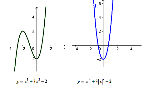 Cho hàm số \(y = {x^3} + 3{x^2} - 2\) có đồ thị như hình bên. Hỏi hình nào được liệt kê dưới đây ở các phương án \({\rm{A}},{\rm{B}},{\rm{C}}\) và \({\rm{D}}\) là đồ thị của hàm số \(y = |x{|^3} + 3{x^2} - 2\).