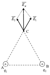 Hai điện tích \({q_1} = {q_2} = {5.10^{ - 16}}C\), đặt tại hai đỉnh B và C của một tam giác đều ABC cạnh bằng 8cm trong không khí. Cường độ điện trường tại đỉnh A của tam giác ABC có độ lớn bằng