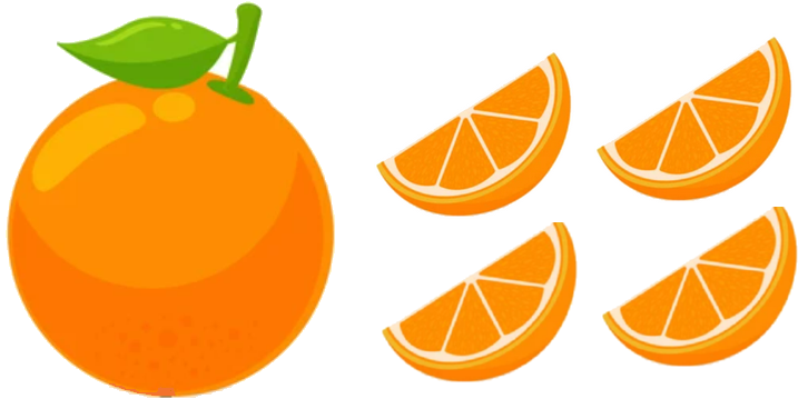 Chia quả cam thành 4 phần bằng nhau, phân số chỉ mỗi phần
