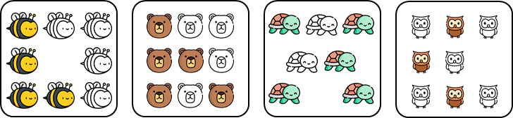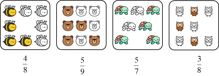 Viết phân số có tử số là số con vật được tô màu, mẫu số là số con trong mỗi hình.
