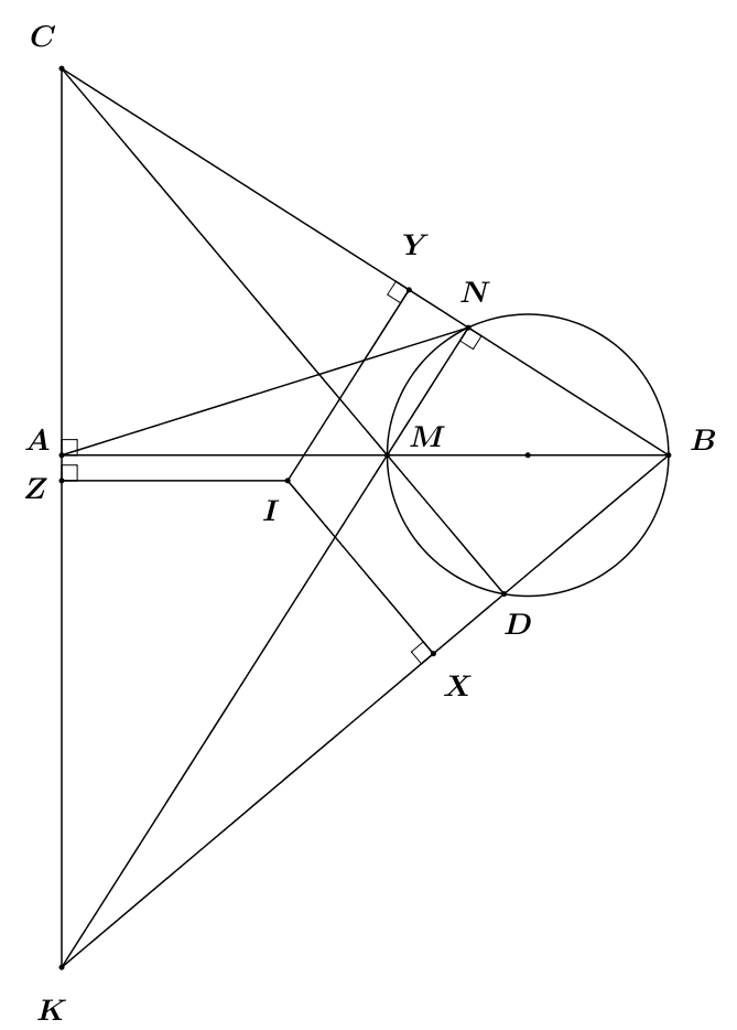 3) Đoạn thẳng BK cắt đường tròn đường kính BM tại điểm D (D khác B). Gọi I là tâm và \(r\) là bán kính của đường tròn nội tiếp tam giác BKC . Chứng minh \(\dfrac{1}{r} = \dfrac{1}{{KN}} + \dfrac{1}{{CD}} + \dfrac{1}{{AB}}\).
