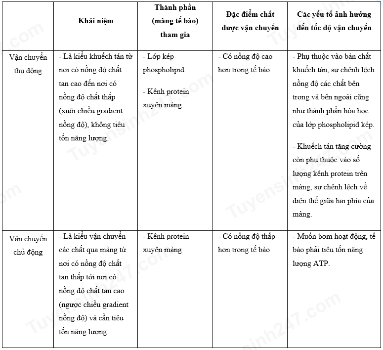 Dựa vào đặc điểm của quá trình vận chuyển các chất qua màng: