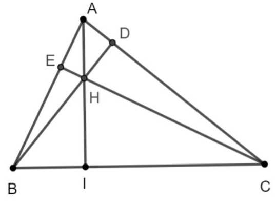 Tam giác \({\rm{ABC}}\) nhọn có các đường cao \({\rm{AI}},{\rm{BD}},{\rm{CE}}\) cắt nhau tại \({\rm{H}}\). Chứng minh rằng:
