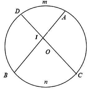 Cho góc BIC có đỉnh \(I\) nằm bên trong đường tròn \((O)\). Hai cung bị chắn của góc BIC là \(\widehat {BnC}\) và \(\widehat {AmD}\) (hình vẽ).