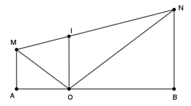 Cho điểm 0 thuộc đoạn \({\rm{AB}}\) sao cho \(AB=3.OA\) Trên cùng nửa mặt phẳng bờ \({\rm{AB}}\), vẽ các tia \({\rm{Ax}}\), By, Oz cùng vuông góc với AB. Lấy \(M\) thuộc Ax và \(N\) thuộc By sao cho \(ON = 2.OM\).