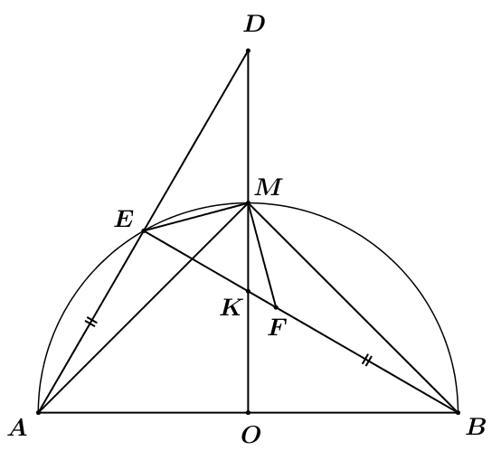 Cho nửa đường tròn tâm O đường kính AB. Gọi M là điểm chính giữa cung AB, E là điểm trên cung AM (E khác A và M). Lấy điểm F trên đoạn BE sao cho BF = AE. Gọi K là giao điểm của MO và BE.