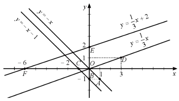 Vẽ đồ thị của các hàm số \(y = - x,y = - x - 1,y = \dfrac{1}{3}x,y = \dfrac{1}{3}x + 2\) trên cùng một mặt phẳng toạ độ.