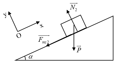 c) Sau khi đi hết quãng đường AB trên, lực kéo ngưng tác dụng, vật tiếp tục trượt trên mặt nghiêng (hình vẽ) BC = 2 m và nghiêng một góc \(\alpha = {30^0}\) so với mặt phẳng ngang. Biết hệ số ma sát giữa vật và mặt phẳng nghiêng \({\mu _2} = \dfrac{{0,2}}{{\sqrt 3 }}\). Vật có lên hết mặt phẳng nghiêng không, vì sao?