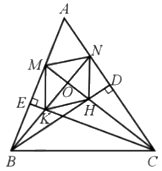 Cho tam giác ABC nhọn có các đường cao BD, CE. Tia phân giác của các góc ACE, ABD cắt nhau tại \(O\) và cắt AB, AC lần lượt tại M, N. Tia BN cắt CE tại \(K\), tia CM cắt BD tại \(H\). Chứng minh: