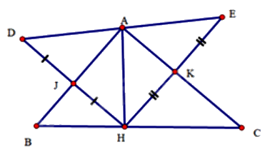 Cho tam giác ABC vuông tại \(A\), có đường cao AH. Kẻ HJ vuông góc với AB tại \(J\) và HK vuông góc với AC tại \(K\). Trên tia HJ lấy điểm \(D\) sao cho \(DJ = JH\). Trên tia HK lấy điểm \(E\) sao cho \(EK = KH\).