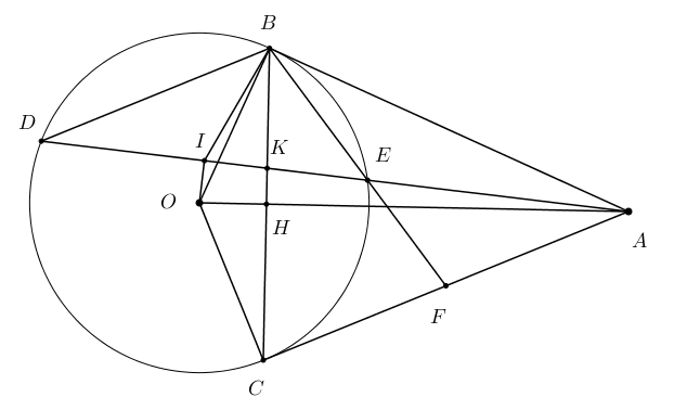 Cho đường tròn (O;R) và điểm A sao cho OA > 2R, vẽ hai tiếp tuyến AB, AC của đường tròn (B, C là các tiếp điểm), kẻ dây cung BD song song với AC. Đường thẳng AD cắt (O; R) tại điểm E (\(E \ne D\)). Gọi I là trung điểm của DE.