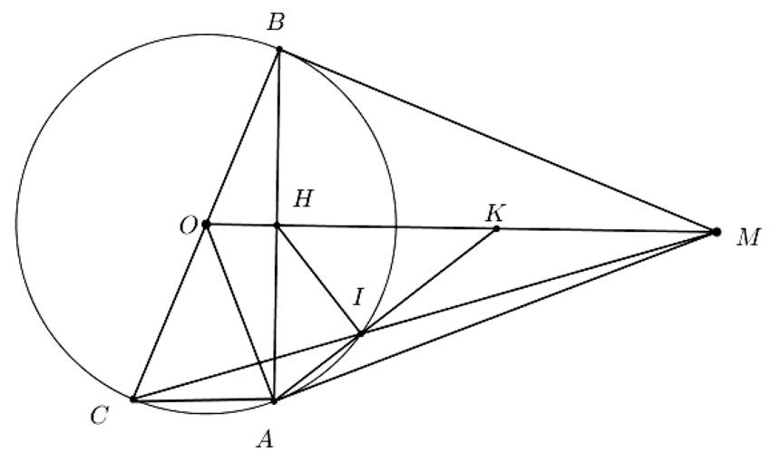 Cho đường tròn tâm O và một điểm M nằm ngoài đường tròn đó. Kẻ các tiếp tuyến MA, MB với đường tròn (O) (A, B là các tiếp điểm). Vẽ đường kính BC của đường tròn (O). Gọi H là giao điểm của MO và AB, I là giao điểm thứ hai của đường thẳng MC và đường tròn (O). AI kéo dài cắt MO tại K .