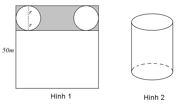Bạn Nam cắt một tấm bìa hình vuông cạnh 50cm để được một hình chữ nhật hai hình tròn (như Hình 1). Bạn ấy cuộn hình chữ nhật và dán hai mép giấy lại với nhau. Bạn ấy dán tiếp hai hình tròn vào hai đầu để tạo thành một cái hộp hình trụ có nắp (như Hình 2).