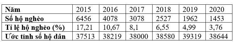 b) Lập bảng thống kê số hộ nghèo, tỉ lệ hộ nghèo từ đó vẽ biểu đồ thể hiện sự thay đổi về số hộ dân của huyền Tây Sơn giai đoạn 2015 – 2020.