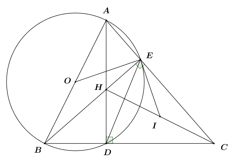 c) Gọi điểm I là tâm đường tròn ngoại tiếp tứ giác CDHE. Chứng minh IE là tiếp tuyến của đường tròn đường kính AB.