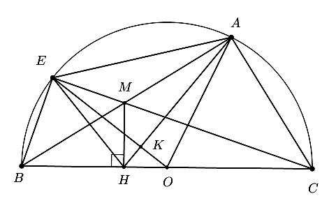 Cho nửa đường tròn tâm O đường kính BC và điểm 4 thuộc nửa đường tròn đó, (A khác B và C). Lấy điểm E thuộc cung AB (E khác A và B) sao cho BE < AC, gọi M là giao điểm của AB và CE. Kẻ MH vuông góc với BC tại H.