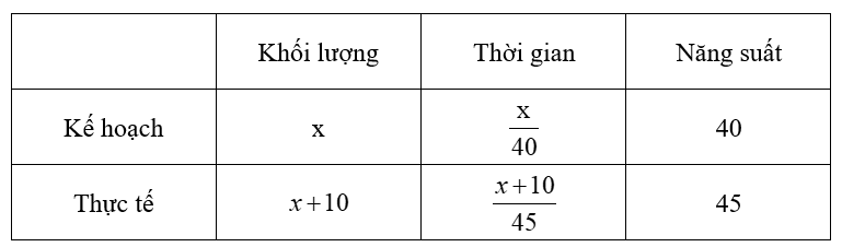 Vì đội hoàn thành xong việc trước kế hoạch 2 ngày nên \(\dfrac{{x + 10}}{{45}} + 2 = \dfrac{x}{{40}}\)