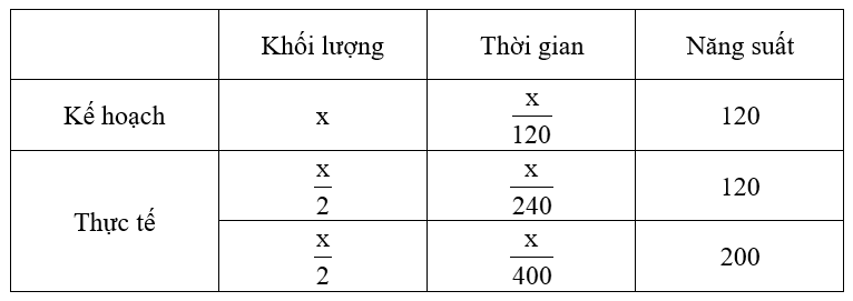 Vì được bổ sung thêm người nên đội hoàn thành xong kế hoạch sớm hơn 3 ngày nên: \(\dfrac{x}{{240}} + \dfrac{x}{{400}} + 3 = \dfrac{x}{{120}}\)