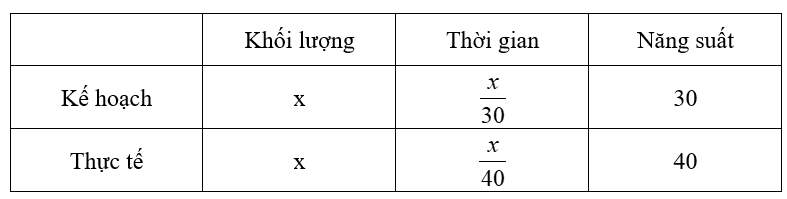 Vì tổ đã hoàn thành trước kế hoạch 3 ngày nên \(\dfrac{x}{{30}} - \dfrac{x}{{40}} = 3\)