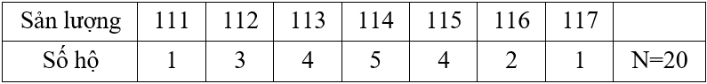 Cho các số liệu thống kê về sản lượng chè thu được trong 1năm (kg/sào) của 20 hộ gia đình