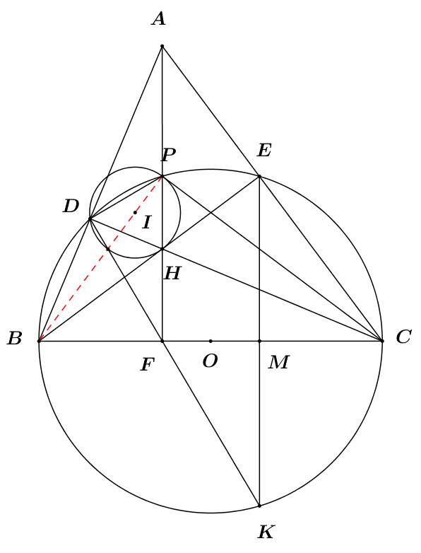 b) Đường thẳng AH cắt BC tại F và cắt đường tròn (O) tại điểm P (P nằm giữa A và H). Đường thẳng DF cắt đường tròn (O) tại điểm K (K khác D). Gọi M là giao điểm của EK và BC, I là tâm đường tròn ngoại tiếp tam giác HDP. Chứng minh \(C{E^2} = BC.MC\) và ba điểm B, I, P thẳng hàng.