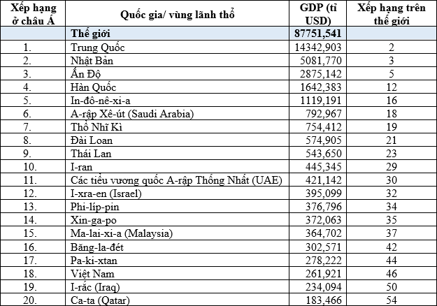 Cho bảng số liệu sau: Xếp hạng các quốc gia ở châu Á theo GDP, năm 2020 Nhận xét nào sau đây