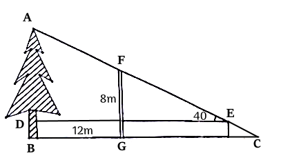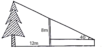 Một cái cây ở phía sau bức tường cao \(8\;{\rm{m}}\) và cách bức tường \(12\;{\rm{m}}\). Một người quan sát đứng trước bức tường ờ vị trí chỉ nhìn thấy ngọn cây, khi đó góc nhìn so với phương ngang bằng \({40^\circ }\) (hình vẽ). Chiều cao của cây là ( làm tròn kết quả đến chữ số thập phân thứ hai )