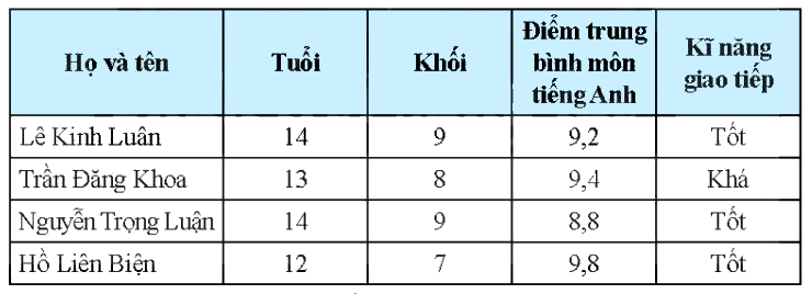 Thông tin về bốn học sinh trong đội thi Hùng biện tiếng Anh của trường Trung học cơ sở Nguyễn Du được cho bởi bảng thống kê sau: